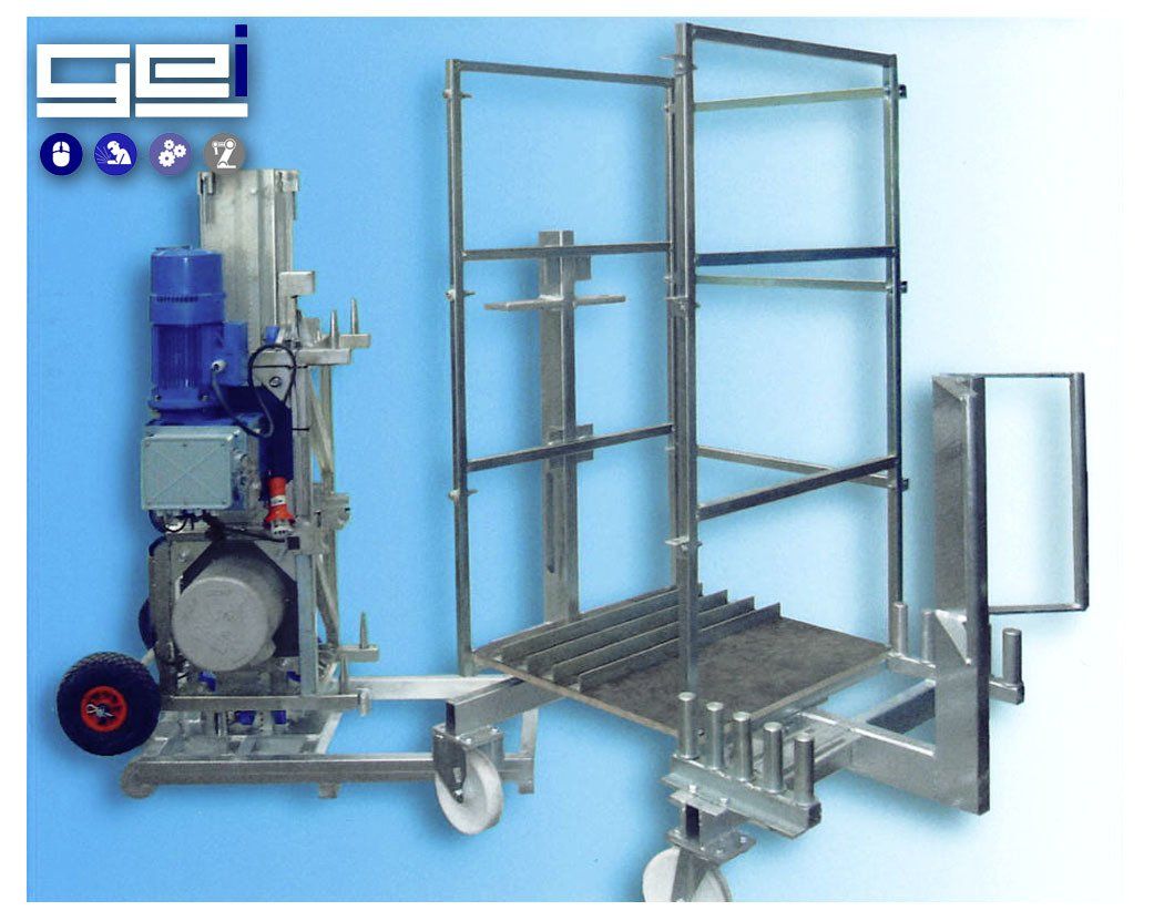- Sobald der beladene Wagen vor der Hebevorrichtung positioniert ist, wird er mit dieser gekoppelt und hebt den gesamten Wagen bis zu der Höhe an, in der der Monteur die Installation durchführt.